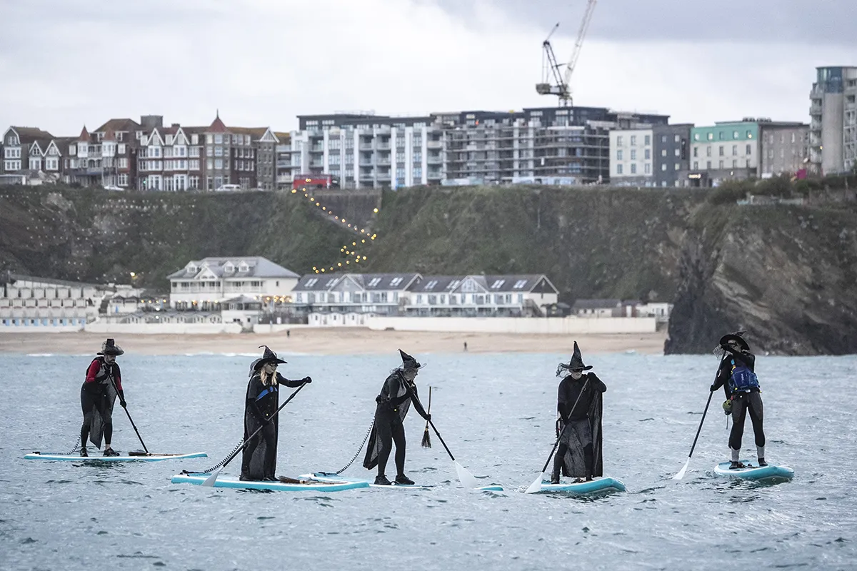 Cloaked in black gowns and pointy hats, a coven of paddling witches glided from Newquay Harbour to Tolcarne Beach in spine-tingling style.